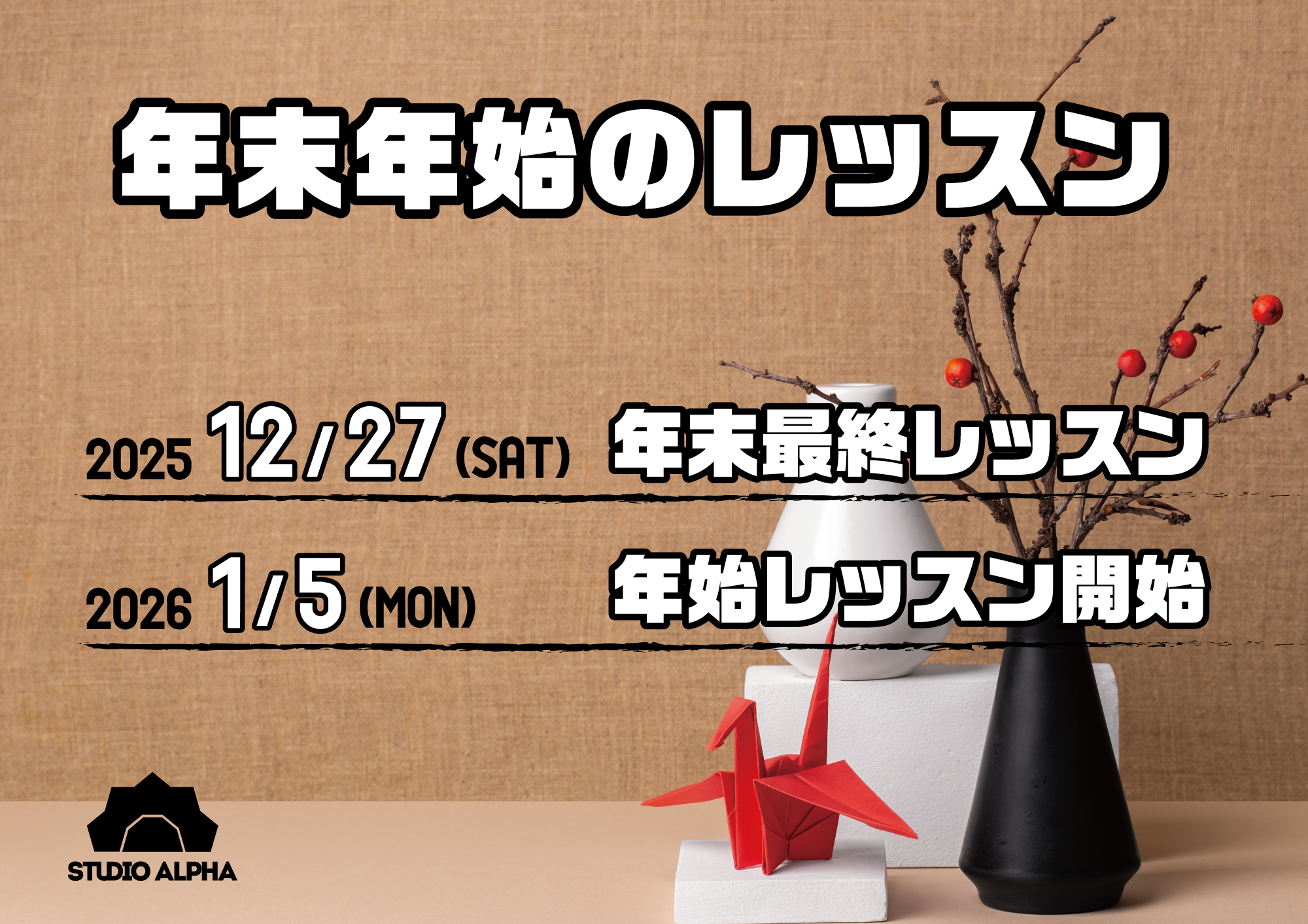 https://studioalpha.net/wp-content/uploads/2025/11/d24b285520be15dad31e6aa148a9310a.png 1413 2000 ALPHA https://studioalpha.net/wp-content/uploads/2025/03/logo_alpha2025.png ALPHA2025-12-02 19:56:002025-12-02 19:56:00年末年始のレッスン【2025-2026】
